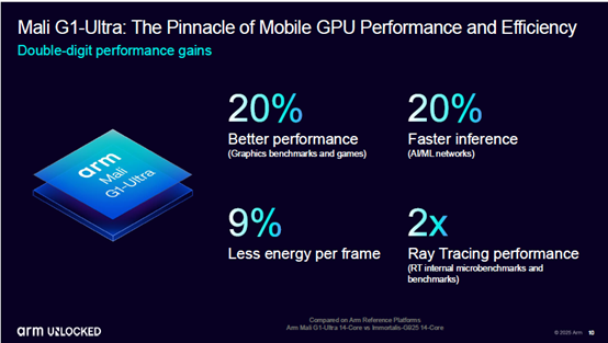 而且,Arm Lumex CSS还拥有全新的Mali G1-Ultra GPU,除了在图形和AI推理等方面得到双位数百分比的性能提升外,还集成了第二代光线追踪技术 (RTUv2),使移动端GPU的光线追踪性能相比上代提升两倍。