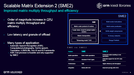 可以说,单看硬件性能,Arm Lumex CSS就已经相当不错了,而这一代平台的最大升级亮点,恰恰在于硬件背后的矩阵扩展技术,也就是我们前面提到过的SME2。