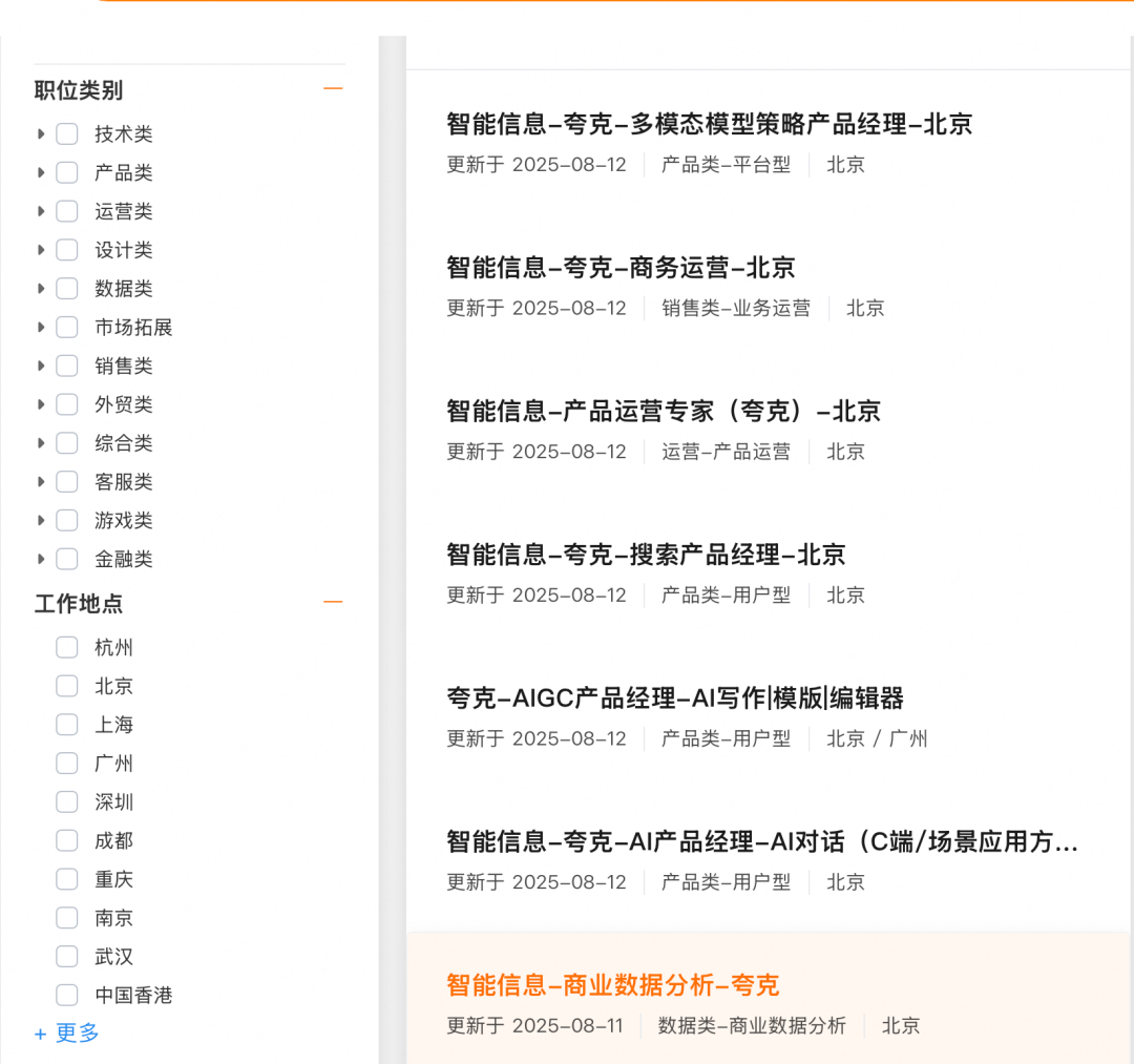 以智能信息事业群的阿里AI旗舰应用—夸克为例,其招聘岗位不仅包括模型训练等基础技术,亦有不少岗位涉及学习、健康、创作等垂类场景。
