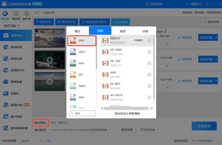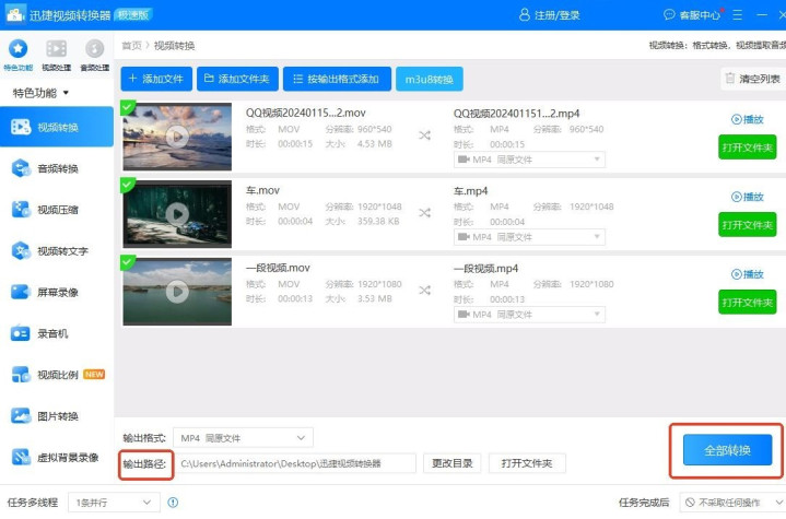 接着根据需求设置一下“输出路径”,最后点击右下角的【全部转换】,稍等一会,即可在指定文件夹中找到转换后的高清视频。