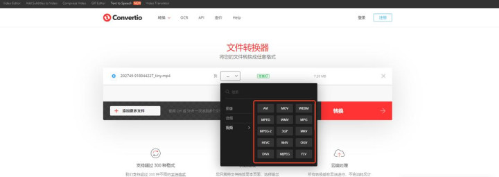 一个基于浏览器的在线文件转换平台,无需安装软件,它的界面简单干净。网站支持导入多种格式的视频,只需要点击导入按钮上传视频,选择输出的视频格式,最后点击转换按钮即可,网站对导入的文件大小有限制。
