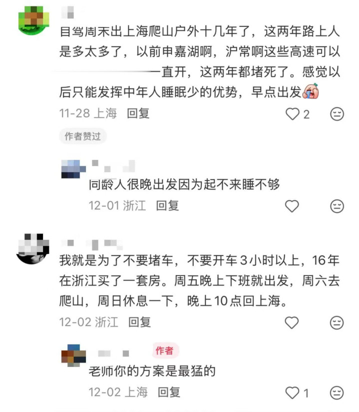 虽说江浙线“堵山成风”,但即便是热门的路线,也有避开人潮的可能性。比如,有人选择提早出发,晚上睡在服务区,第二天一早进山,下午三四点钟结束返程,刚好与人潮错开时间。