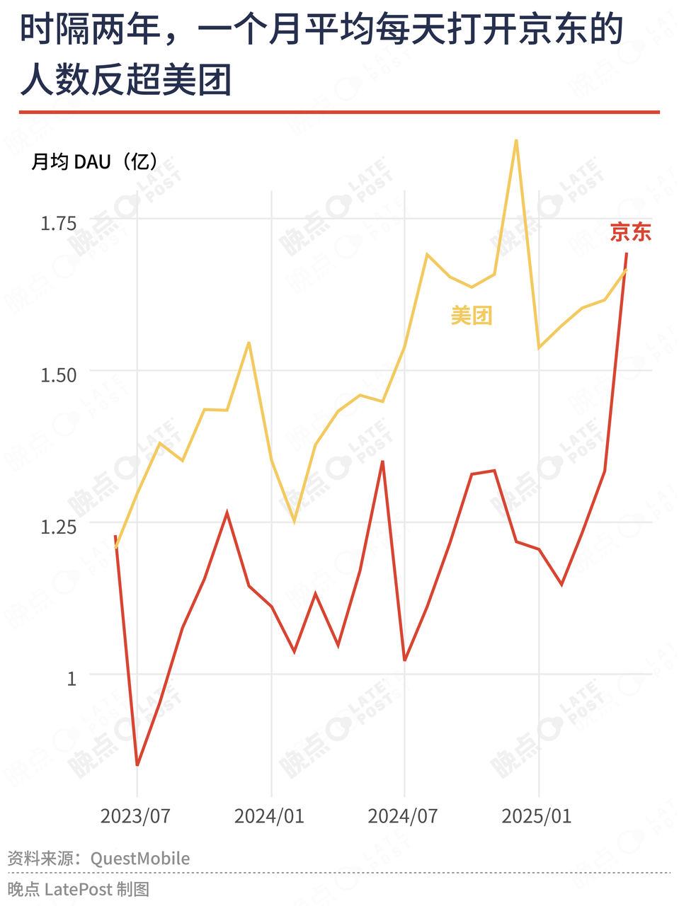 京东在二季度开始加大餐饮外卖的补贴力度。2025 年 5 月,在京东上,一个月平均每天打开它的人数跃升到 1.69 亿,这个数据时隔两年反超了美团。